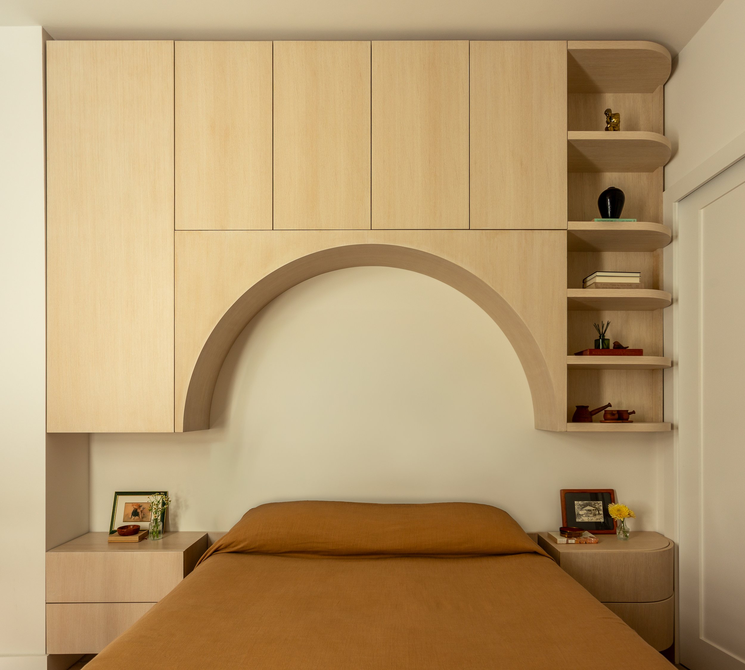 The bedroom, similar to the living room, is transformed through the design of a new built-in wall unit that provides open and closed storage and uses the arch to create a “negative” headboard. Sitting aside the bed and below the upper unit are two built-in nightstands with drawers, one featuring an arch filleted detail that echoes the shape of the shelving above.